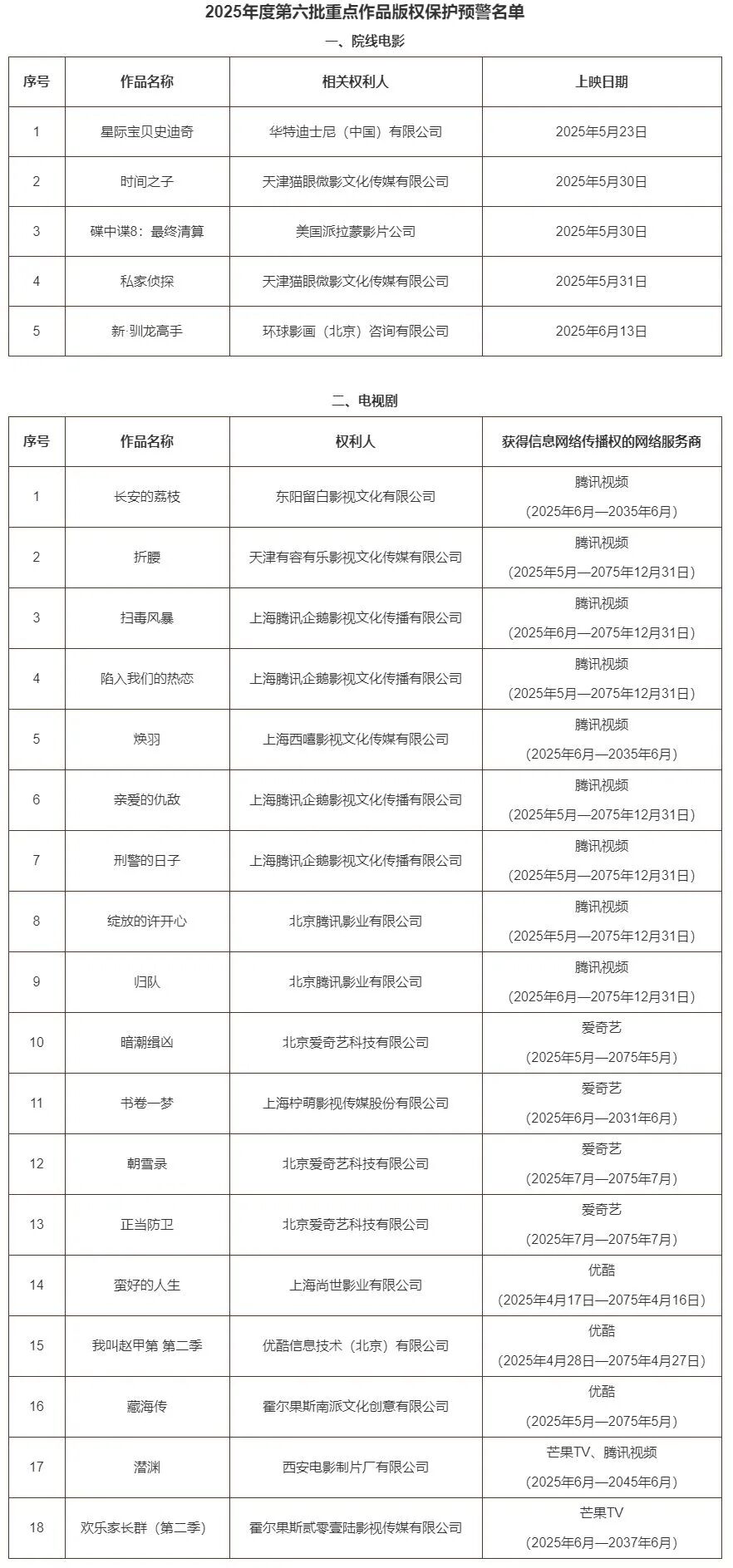 按照国家版权局《关于进一步加强互联网传播作品版权监管工作的意见》及版权重点监管工作计划,根据相关权利人上报的作品授权情况,现公布2025年度第六批重点作品版权保护预警名单。
